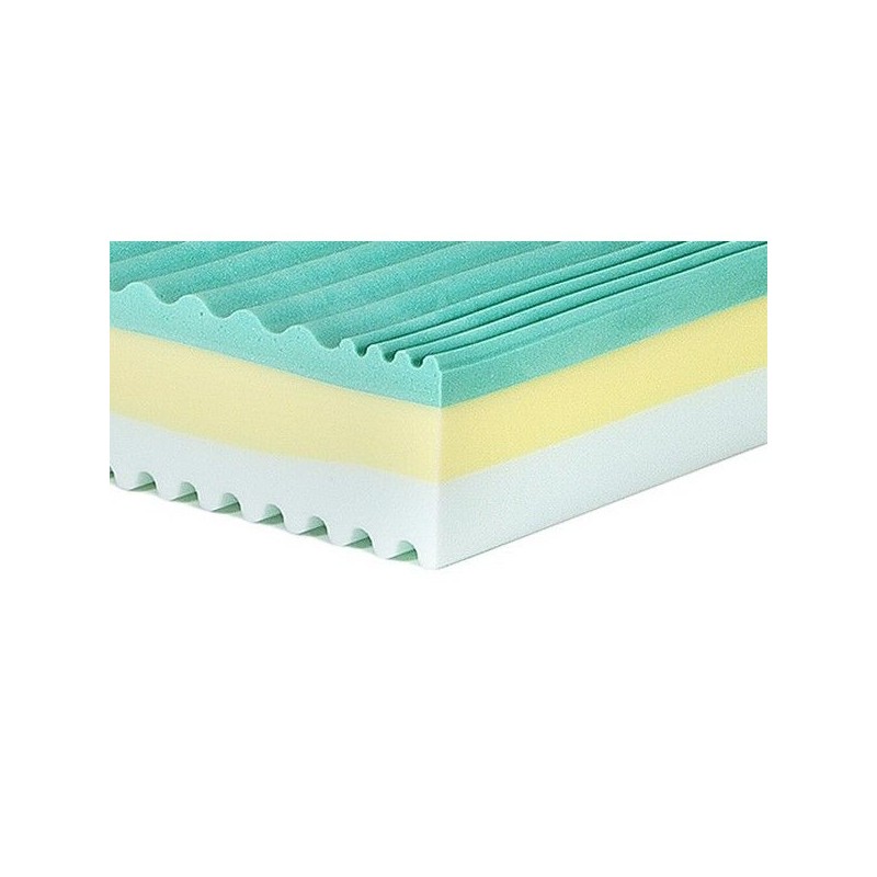 Il materasso tricomfort matrimoniale è composto da una lastra a 3 strati, la base doppia in waterfoam alta 15,2 cm, con una densità di portanza 25, lo strato superiore composto dal memory alto 4,8 cm, con una densità di portanza pari a 42. La parte interna del materasso è sagomata con effetto massaggiante, ed alta in totale 20 cm.